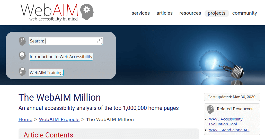 WebAIM conducted a comprehensive research on a million websites which revealed that the average website had around 60 accessibility errors (barriers) which makes them an exclusionary experience for about 12% of the world's population.